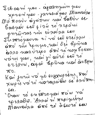 “Παιδί μου, σε παρακαλώ, όταν φύγω, να μου κάνεις ένα σαρανταλείτουργο και πάντοτε να με μνημονεύεις”. Είχε δώσει εντολή στη θανή του να παρευρεθούν οι γείτονες, με τους οποίους πέρασε την παρούσα ζωή. Δι’ εμέ είχε δώσει ευλογία να με καλέσουν. Τον ευχαριστώ. Τη νύκτα της θανής του τον βλέπω στον ύπνο μου ντυμένο λευκή ιερατική στολή, αστράπτοντα, χαριέστατον και λέγοντα: “Παπαδάκο μου, υπάγω να λειτουργήσω”