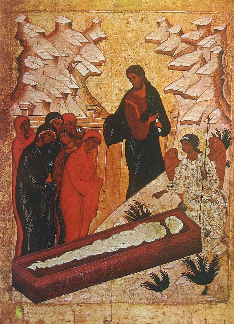 Γνῶσιν ἄγνωστον γνῶναι ,Ἰωάννης σὺν Πέτρῳ ζητοῦντες , ἔδραμον, σκοτίας ἔτι οὔσης, εἰς τὸ μνημεῖον.Καὶ θεωροῦντες κείμενα τὰὀθόνια μόνα, ἐβόων μετὰ δέους πρὸς τὴν Θεοτόκον