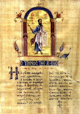 Ἡ ἀγάπη μακροθυμεῖ, χρηστεύεται, ἡ ἀγάπη οὐ ζηλοῖ, ἡ ἀγάπη οὐ περπερεύεται, οὐ φυσιοῦται,